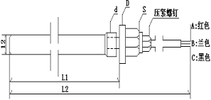 5、例如WZP-201-3:表示Pt100傳感器,螺紋M27×2,插入深度200mm長,總長550mm。直徑12mm
