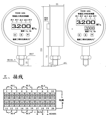 TDSB-484ZL系列壓阻式智能數(shù)顯壓力變送器、控制器是集壓力測量、顯示、控制于一體的多功能產(chǎn)品。該產(chǎn)品為全電子數(shù)字技術(shù)。結(jié)構(gòu),前端采用帶隔離膜充油芯體的壓阻式壓力傳感器,輸出信號由高精度、低溫漂和高可靠性的放大電路轉(zhuǎn)換為標(biāo)準(zhǔn)信號。它使用方便,參數(shù)在儀表盤面設(shè)定,廣泛應(yīng)用于電力、自來水、水處理、石油、化工、冶金等行業(yè),對流體介質(zhì)的壓力進行監(jiān)控,是指針電接點壓力表的理想替代產(chǎn)品。