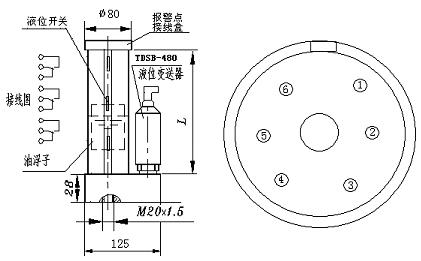 報(bào)警點(diǎn)接線盒:端子1、2為上限,液位高于上限時(shí)斷開,低于上限時(shí)閉合;端子3、4為中點(diǎn),液位高于中點(diǎn)時(shí)斷開,低于中點(diǎn)時(shí)閉合;端子5、6為下限,液位低于下限時(shí)閉合,高于下限時(shí)斷開。