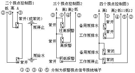 2)、二個報警信號:接點為常開,位置出廠設(shè)置在最高和最低位置;三個報警信號:均為常開,高2設(shè)在 50%,四個報警信號:高1高2為常開、低11低12為常閉,高2設(shè)在85%、低12設(shè)在15%,接線端見下圖,若有不同要求請說明,報警位置用戶也可自行調(diào)整。